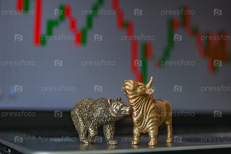 Бык и медведь как символы биржевой торговли на размытом фоне ценовой графики. Понятие символики товарных и финансовых мировых рынков