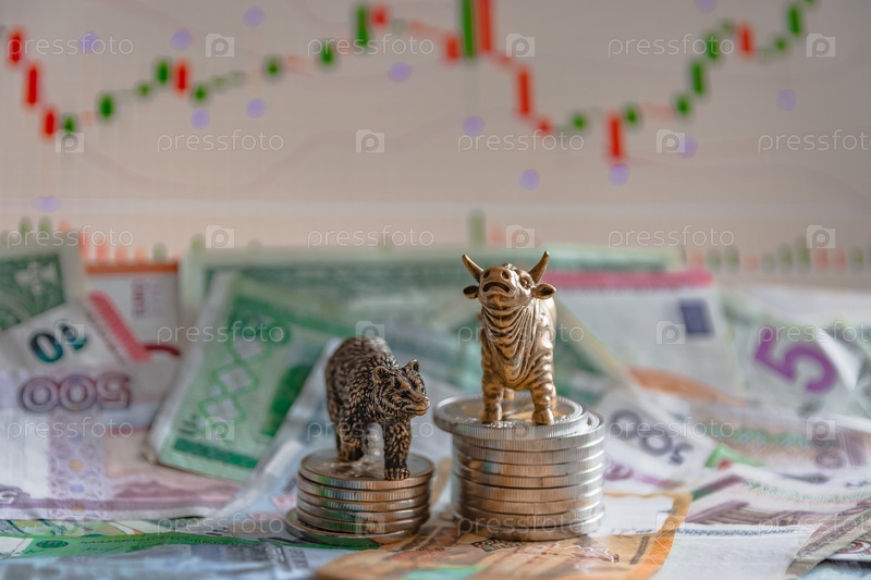 Бронзовые фигуры быка и медведя возле металлических монет на фоне бумажных денег и диаграмм. Размытие фона и перспективы. Концепция и символ фондовой биржи и торговли акциями