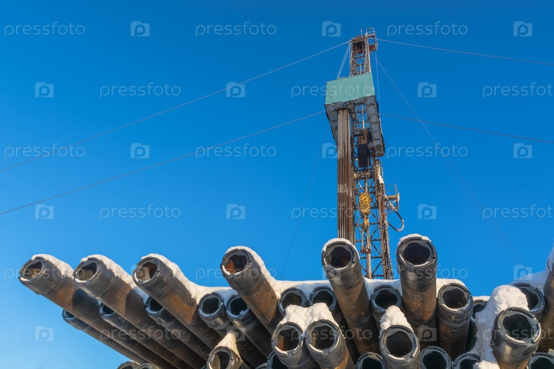 Установка для бурения нефти и газа. На заднем плане голубое небо. На переднем плане трубы, покрытые снегом. Зима в Арктическом регионе