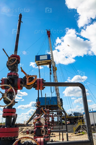 Мобильная буровая установка для бурения нефтяных и газовых скважин. На фоне голубого неба. Арматура для добычи нефти и газа расположена рядом с буровой