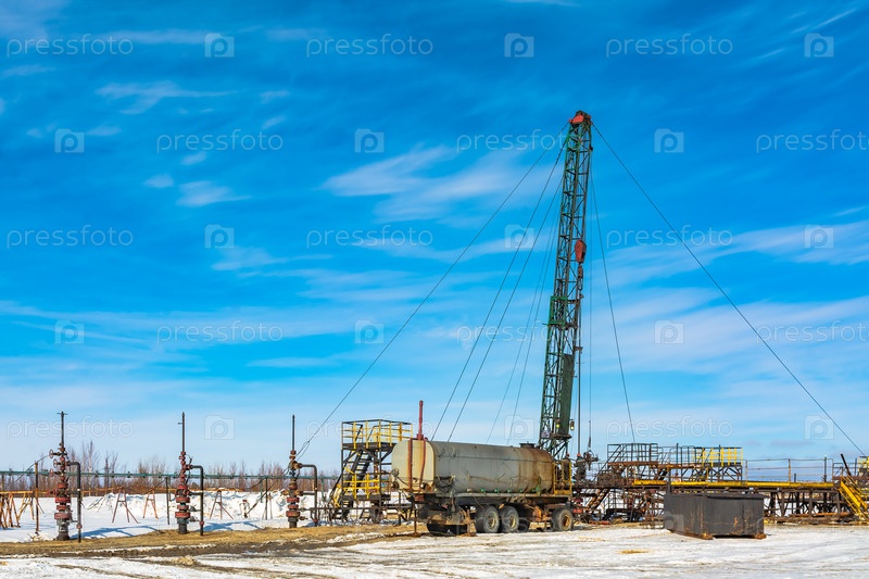 Нефтяное месторождение в Сибири. В ряду расположены нефтедобывающие скважины. На заднем плане ведутся работы по капитальному ремонту скважины. Весна. На земле остатки снега