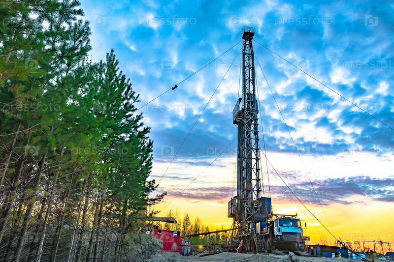 Бурение глубокой скважины мобильной буровой установкой на месторождении нефти и газа. Месторождение расположено на Крайнем Севере в тайге. Красивое драматическое закатное небо на заднем плане