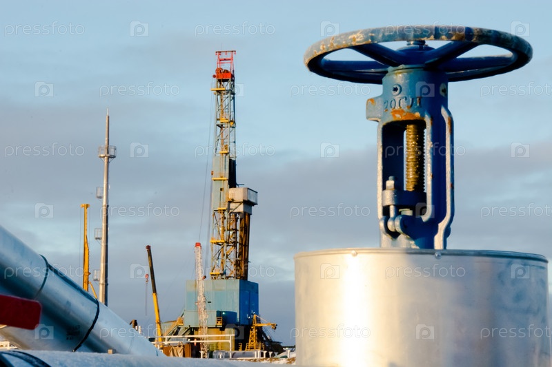 Оборудование и инфраструктура для добычи газа из скважин арктического месторождения. Зимний полярный день. Буровая установка на заднем плане