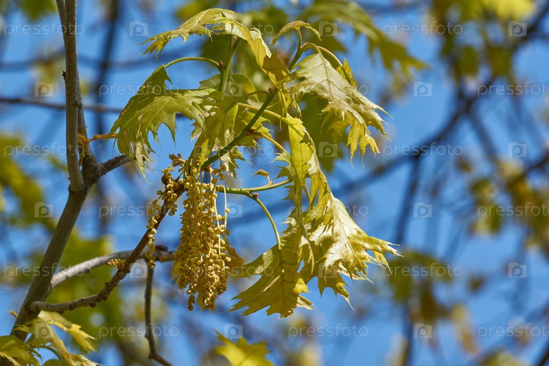 Дуб красный (лат. Quercus Rubra) цветет, распускаются соцветия.Дуб красный (лат. Quercus Rubra) дерево, разновидность рода дуб семейства буковых (Fagaceae).Весна