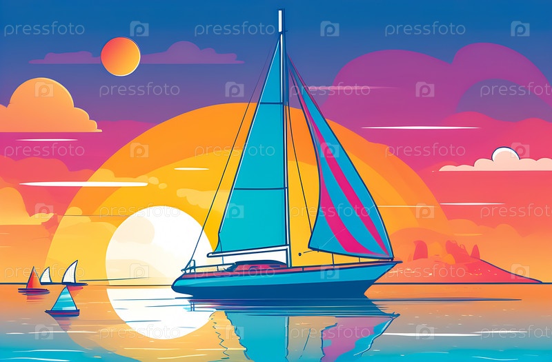 Иллюстрация яхты в море на фоне заката