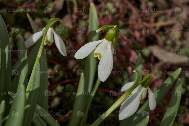 На лужайке в саду цветут подснежники. символ весны. род многолетних трав семейства Амариллидовых (Amaryllidaceae)