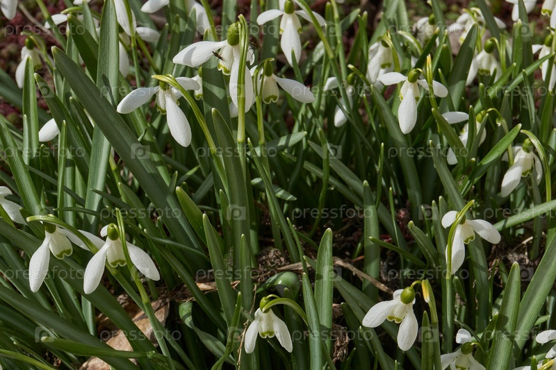 На лужайке в саду цветут подснежники. символ весны. род многолетних трав семейства Амариллидовых (Amaryllidaceae)