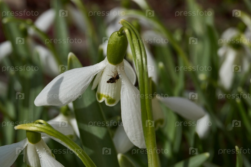 На лужайке в саду цветут подснежники. символ весны. род многолетних трав семейства Амариллидовых (Amaryllidaceae)