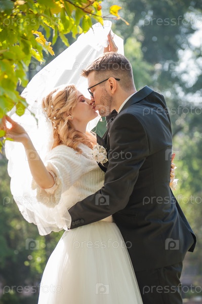 Жених и невеста целуются на свадебной фотосессии