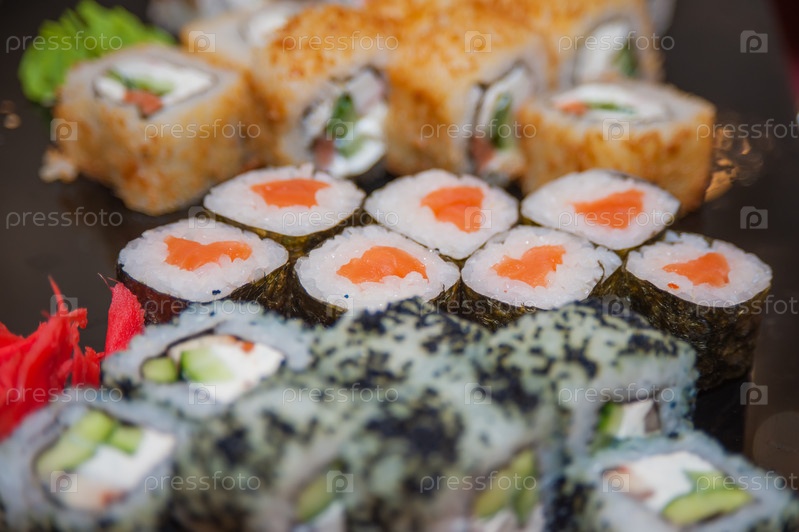 Роллы и суши с красной рыбой на праздничном столе