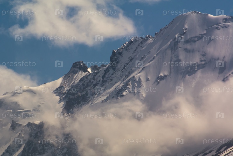 Снежные горные вершины среди облаков, Киргизский хребет, урочище Чонкурчак, страна Кыргызстан. Селективный фокус