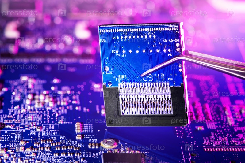 Электронный чип с пинцетом. Производственный чип компьютера или ремонт компьютерной системы. Селективный фокус