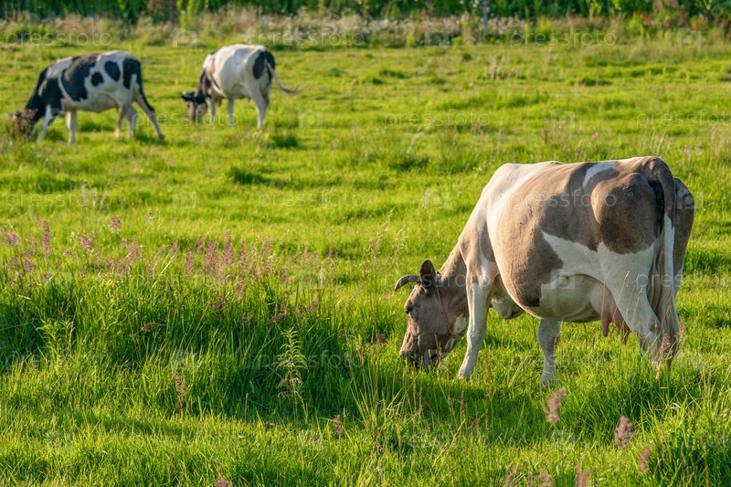 Коровы пасутся на сочном лугу в летний день