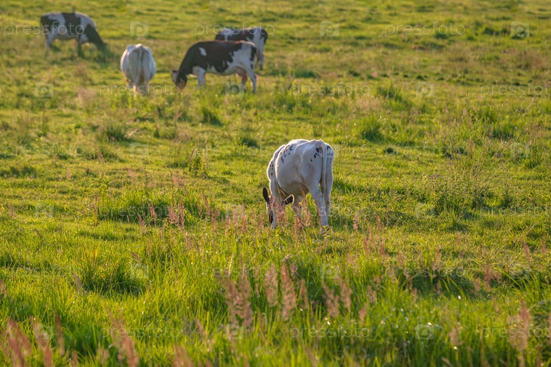 Коровы пасутся на сочном лугу в летний день