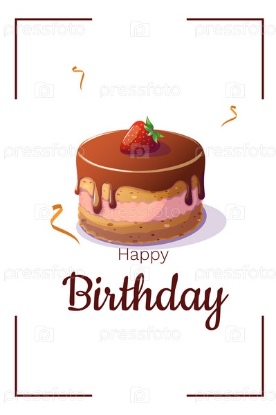 Открытка на день рождения с тортом и праздничными лентами. Торт на день рождения. Векторная иллюстрация. Открытка, приглашение