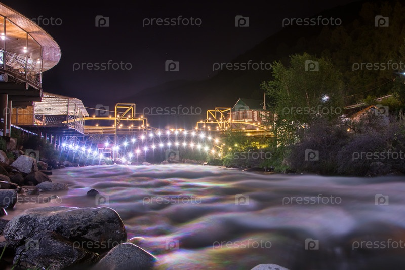 Горная река Аламедин ночью на фоне освещенного моста