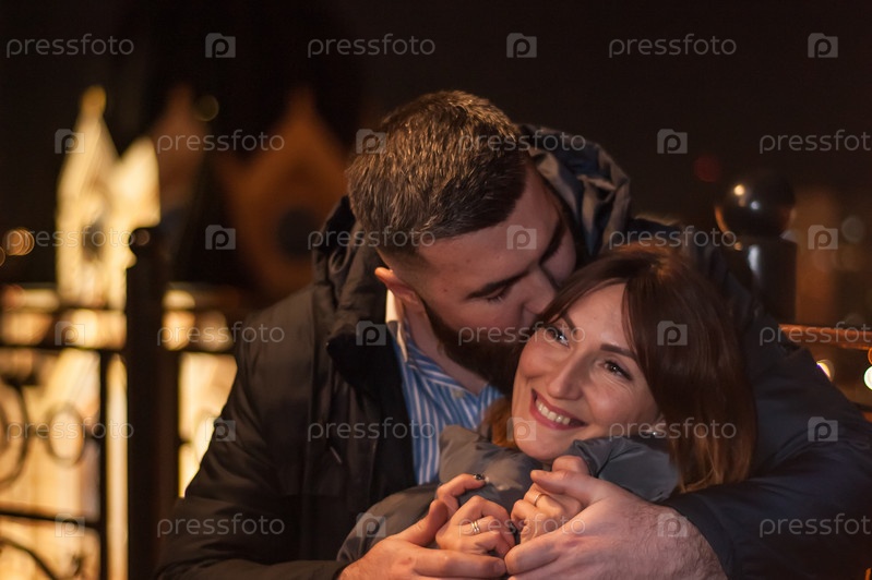 Молодые люди, мужчина и женщина на свидании ночью на фоне городских огней