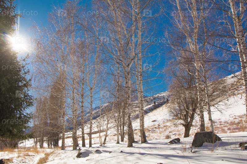 Зимний березовый лес под солнцем