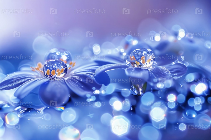 Макро капли воды на голубых цветах