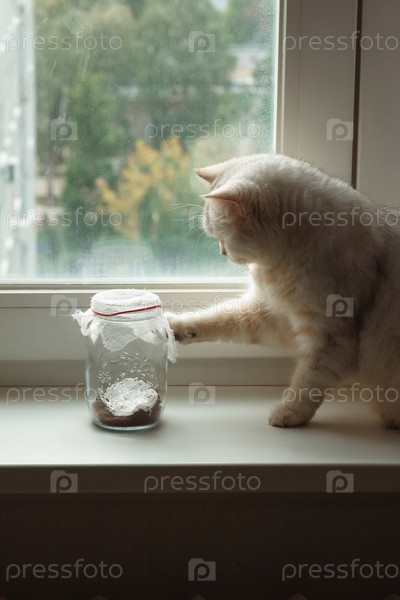 Белый британский кот играет с бабочкой, летающей в стеклянной банке