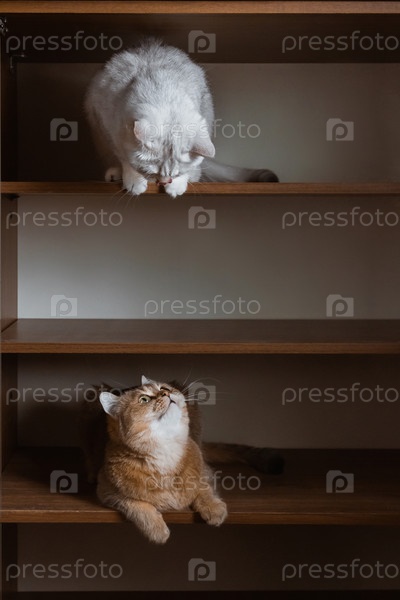Две домашние кошки британской породы смотрят друг на друга с разных полок шкафа