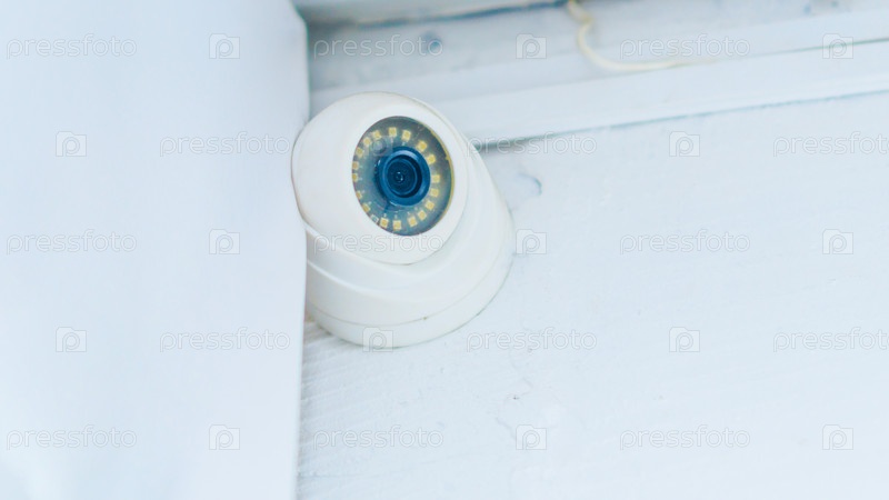 Внутренняя камера видеонаблюдения на белой стене под потолком