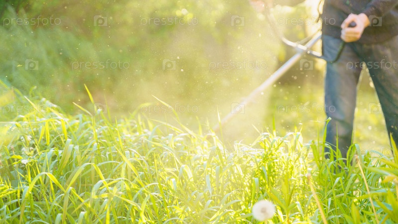 Мужчина косит траву триммером, фокусируется на размытом фоне переднего плана