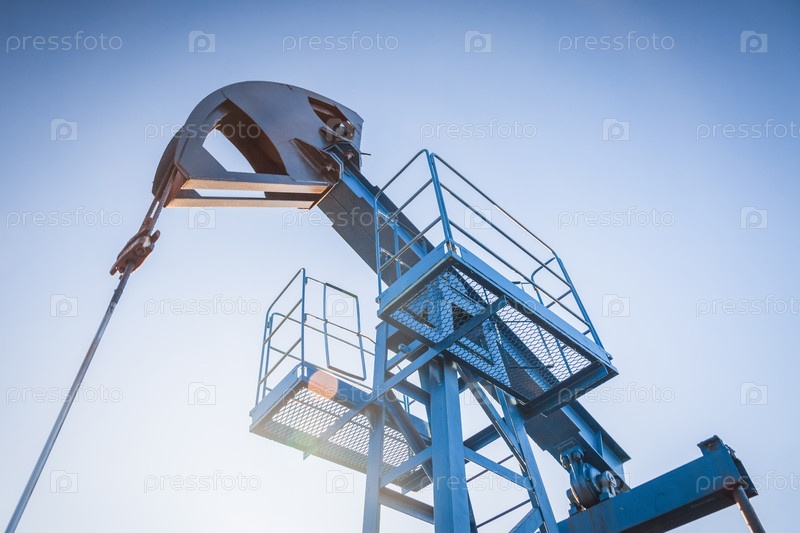 Масляный насос на фоне голубого неба и утреннего солнца, солнечные блики на масляном насосе