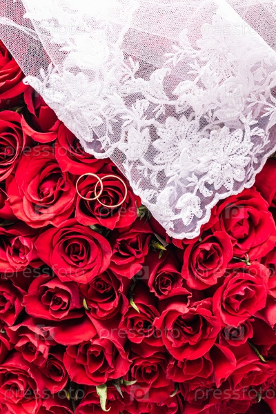 Фоновое изображение для свадебного дизайна или макета. Два золотых обручальных кольца на фоне букета красных роз. белая фата. Вид сверху. Копировальное пространство