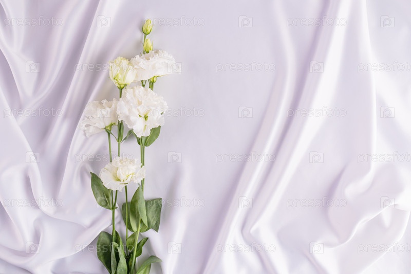 Нежный свадебный фон для дизайна, открытки, приглашения. белые складки атласной ткани и белые живые цветы. Романтический дизайн. Копировальное пространство