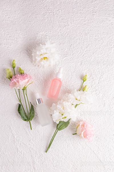 Два матовых косметических флакона с пипеткой с натуральным средством ухода за собой на светлом фоне с цветами аустомы. Вертикальный вид сверху