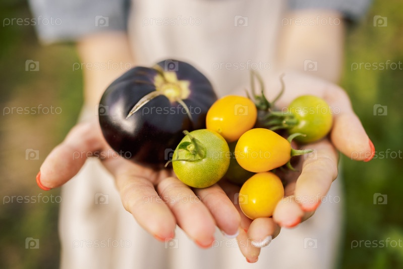 Различные виды помидоров в женских руках. Руки женщины с аккуратным маникюром держат спелые черные, желтые и красные овощи. Урожай сортов томатов