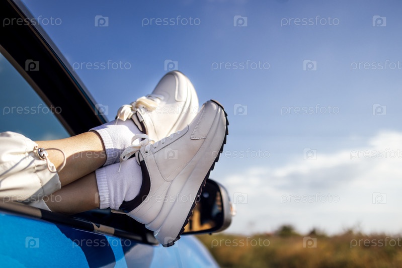 Крупный план женских ног в белых кроссовках выставлен в окне машины. Путешествие на автомобиле. Голубое небо и поле на заднем плане