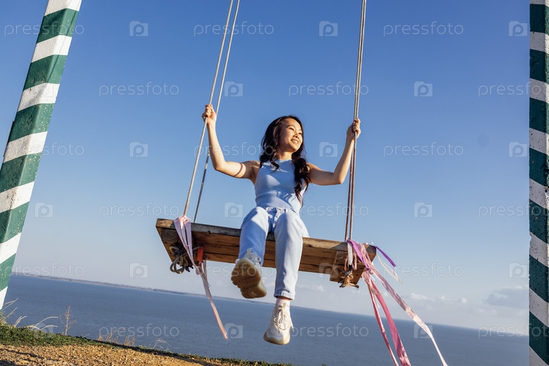 Привлекательная азиатская девушка в повседневной одежде качается на качелях на открытом воздухе. Счастливая кореянка смеется и радуется жизни. Морской пейзаж и голубое небо