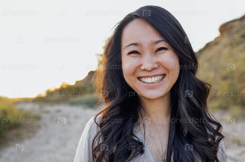 Молодой привлекательный азиат с длинными волнистыми волосами на открытом воздухе. Очаровательная кореянка