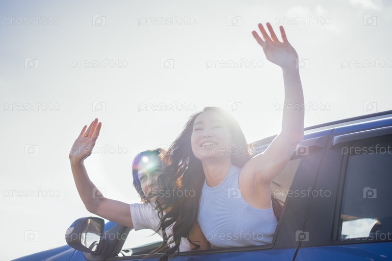 Молодые женщины смотрят в окно машины и смеются