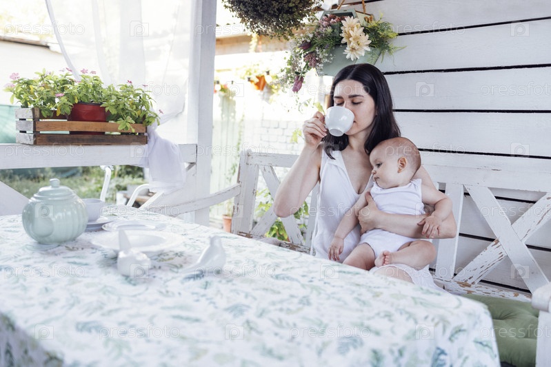 Молодая красивая мать пьет чай и держит на руках милого малыша в белом боди