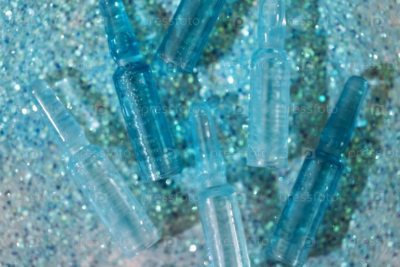 Синие ампулы с интенсивным увлажняющим концентратом с гиалуроновой кислотой и витаминами на блестящем сверкающем фоне