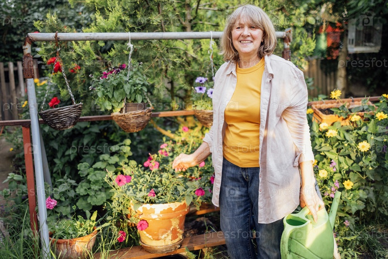 Пожилая улыбающаяся женщина поливает цветы в подвесных горшках из лейки
