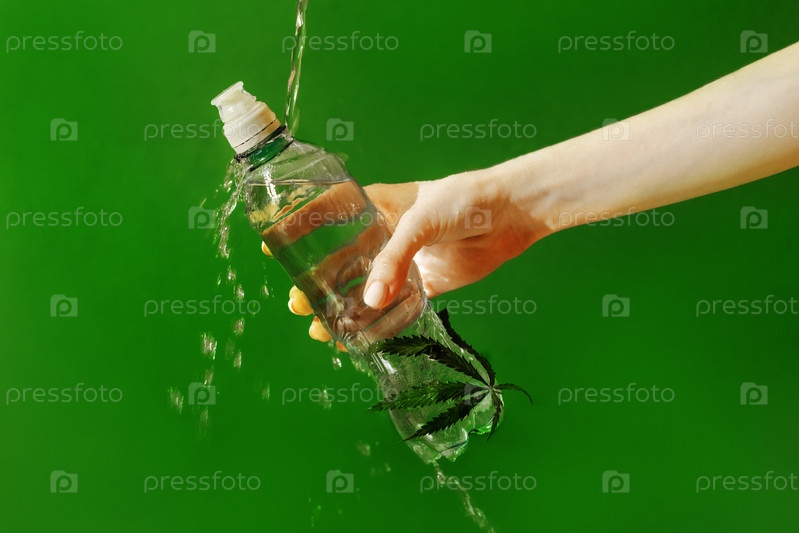 Крупный план женской руки с аккуратным маникюром, держащей макет пластиковой бутылки с листом конопли. Свежая минеральная вода с брызгами и коноплей