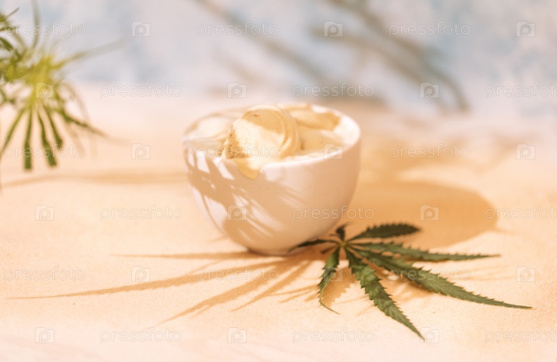Белая керамическая миска с вкусным мороженым и листом конопли. Сладкое лакомство с коноплей на золотом песке. Вкусная холодная вкуснятина