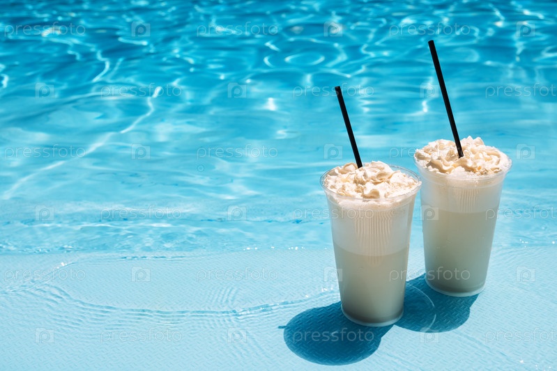 Два стакана вкусного охлажденного коктейля. Молочный коктейль со взбитыми сливками