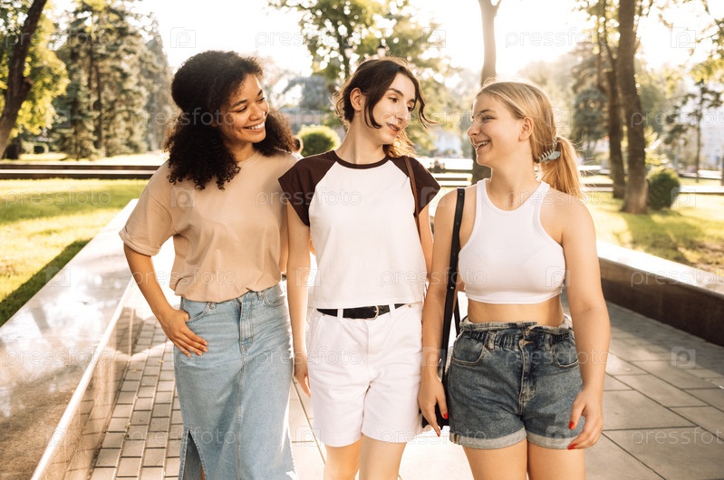 Счастливые милые девушки разных рас болтают и гуляют в парке