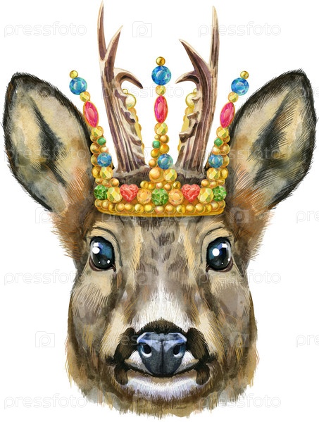 Акварельный рисунок животного - косуля в золотой короне, эскиз