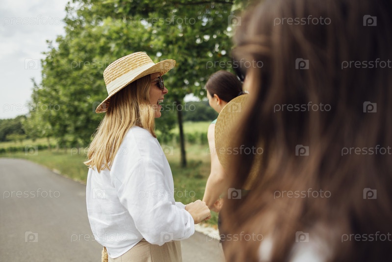 Три молодые женщины в повседневной одежде и соломенных шляпах радостно бегут по дорожке в парке