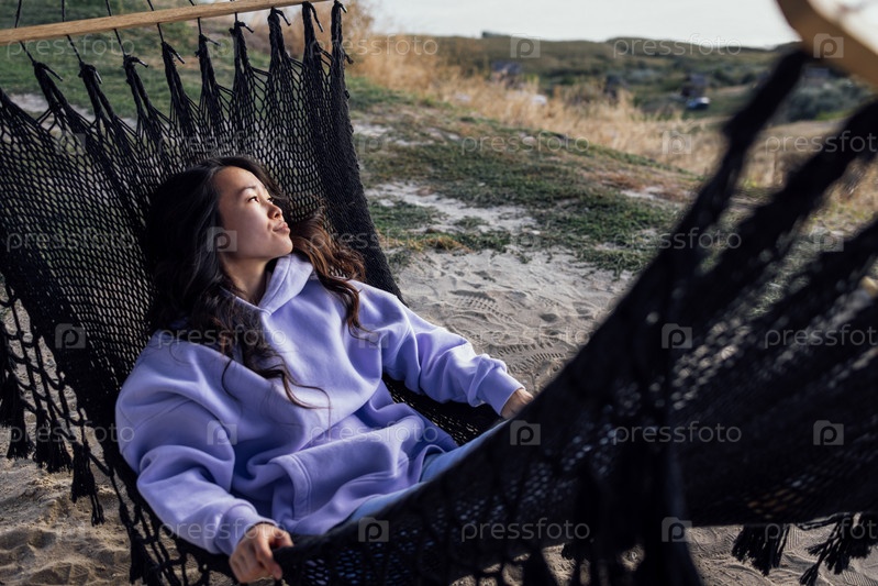 Молодая очаровательная азиатка лежит в гамаке и смотрит на горы. Красивая кореянка в повседневной одежде наслаждается отдыхом на свежем воздухе