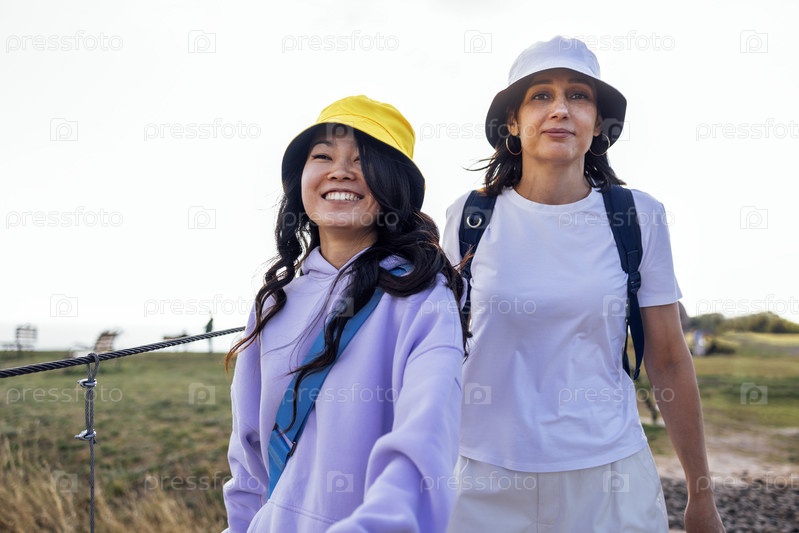 Два многонациональных друга в повседневной одежде и панамах с рюкзаками на экскурсиях на природе. Молодые веселые женщины разных рас путешествуют и вместе развлекаются на свежем воздухе