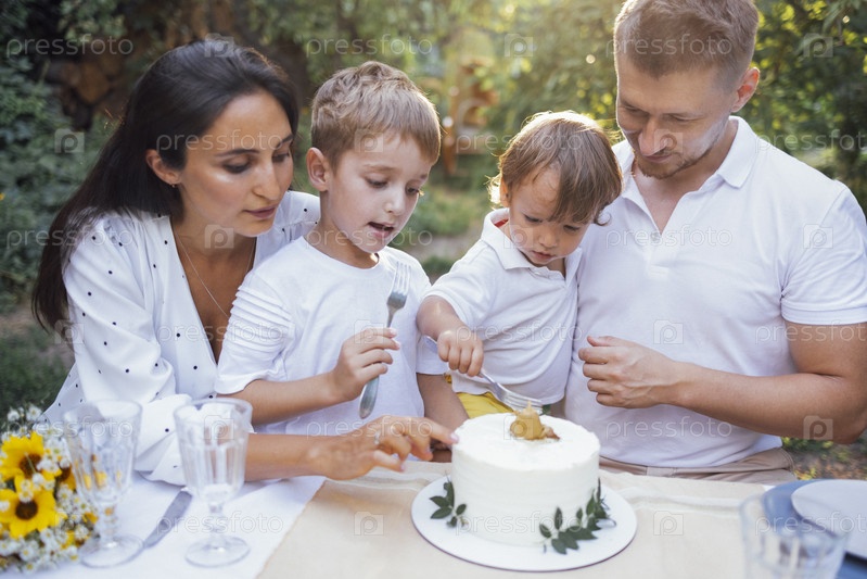 Счастливая белая семья празднует день рождения. Мама, папа и двое маленьких сыновей в белой одежде едят торт в кафе под открытым небом