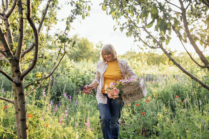Пожилая улыбающаяся женщина собирает полевые цветы в плетеную корзину