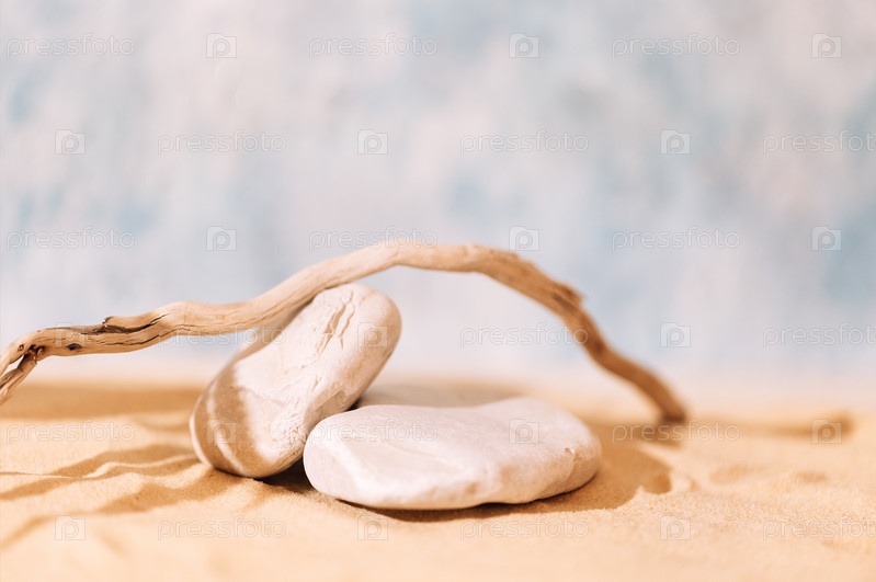 Сцена для косметической косметики с текстурированными камнями и веткой дерева. Пустой подиум для выступления с песком и солнечным светом